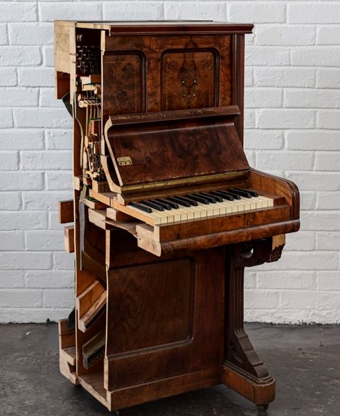 The work consists of a fragment of an upright piano, purchased from the historic The Kimberley Hotel in Cape Town during the Covid lockdown, which has been cut down to measure a third of its original size, thereby revealing the inner workings of the instrument.