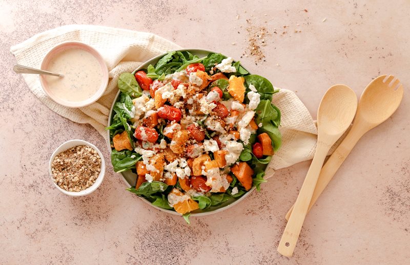 Roasted butternut salad with Amasi dressing – Balancing tangy and sweet, as well as fresh but hearty, this is a vibrant summer salad elegantly finished with velvety chevin, crunchy dukkha and creamy Amasi dressing.