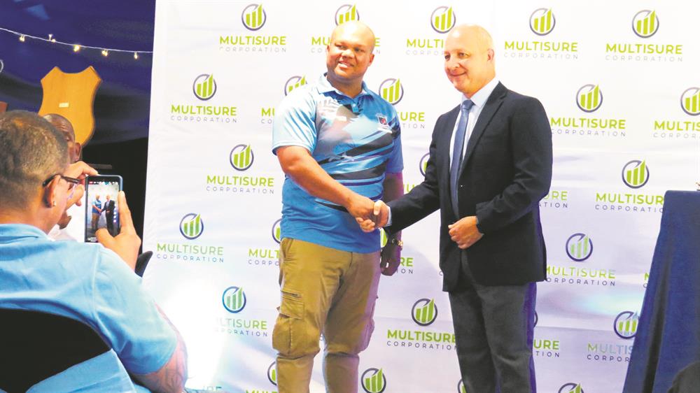 Welcome to the club - Gershwin Stevens (left) extends Knysna United Rugby Club's gratitude and thanks to Denton Goodford (right), owner of the new headline sponsor Multisure Corporation.