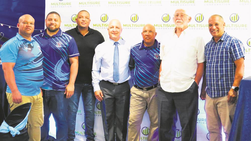 Gershwin Stevens (vice chairperson of Knysna United), Lyle Bastian (Knysna United coach), Enrico Saaiers (Knysna United), Denton Goodford (founder and owner of Multisure Corporation), Desmond van Rooyen (Head Coach Knysna United, Tom Paremoer (Knysna United) and Salvin Hannie (Knysna United). Photos: Rozano Alie