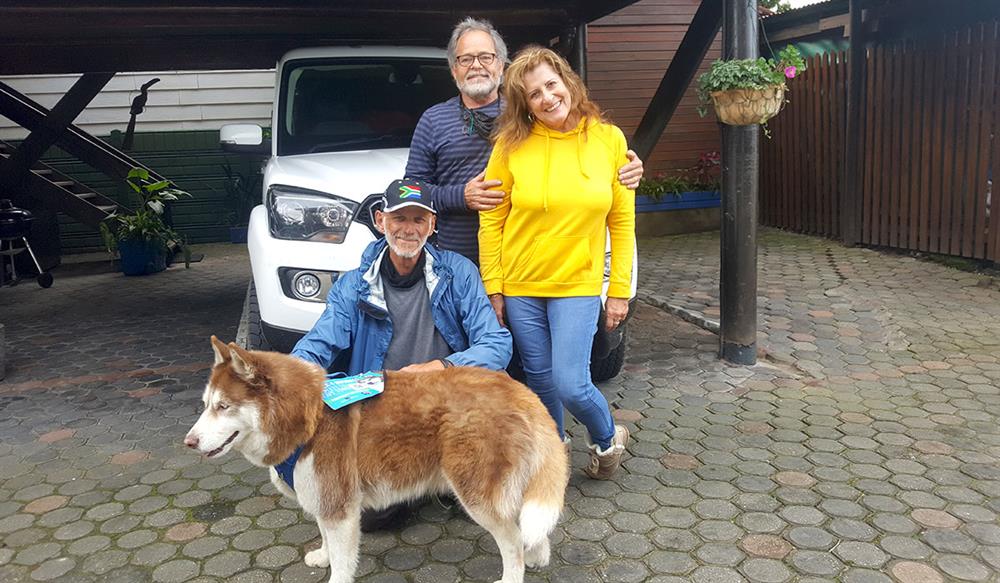 Jaxx and Desmond Langkilde posing with their overnight hosts André and Laurette Botha, owners of pet-friendly Lakeside Accommodation Knysna.