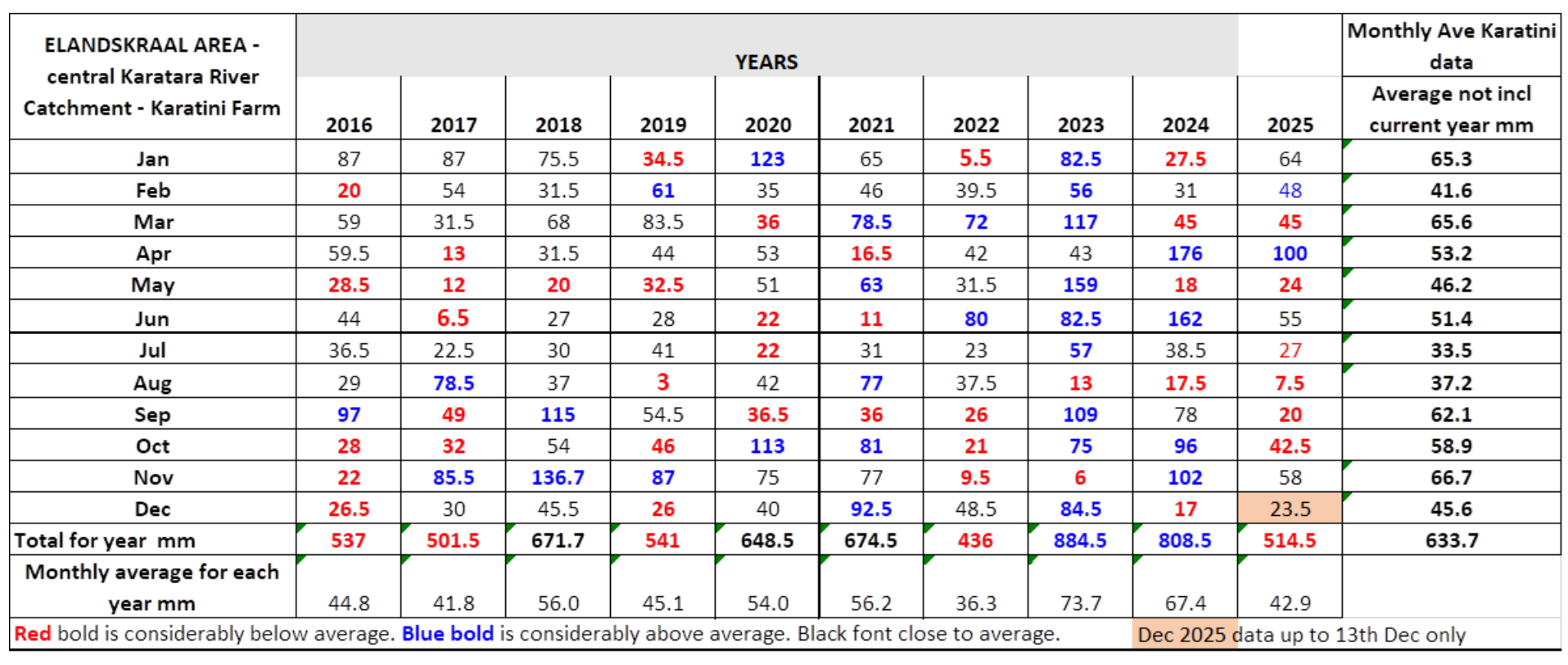 The table and comment below includes the December rainfall up until 13 December 2025.