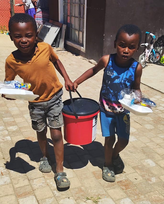 Kinders was self handig met die uitdeel van kos emmers by die geleentheid.