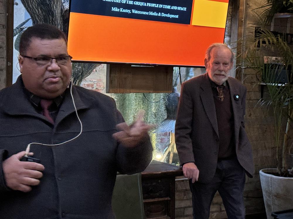 Roderick Williams, left, of the Griekwa Nasionale Konferensie makes a point during the talk on the Griqua people by Mike Kantey, right.