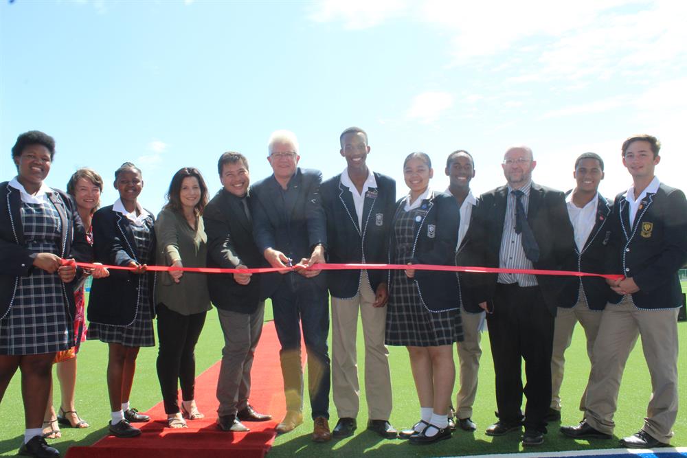 MEC Alan Winde (centre), mayor Mark Willemse and learners and staff at the official opening of the school's new astroturf hockey field.