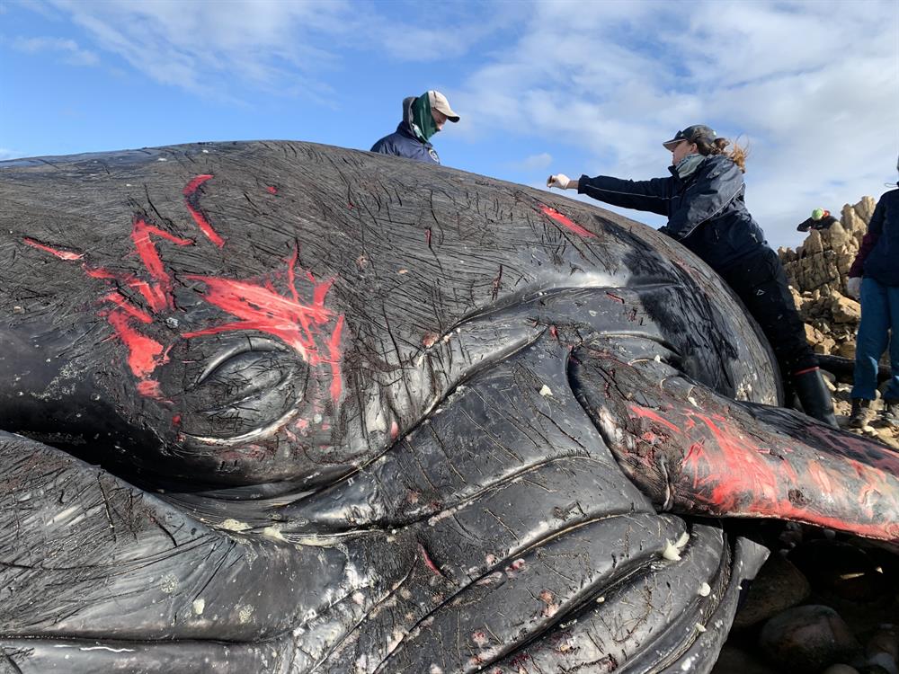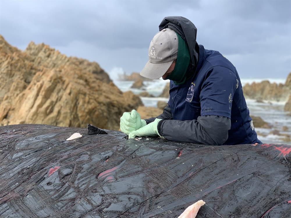 Chris King, member of the Plettenberg Bay Disentanglement Network's Stranding Response Team, collects samples from the carcass.
