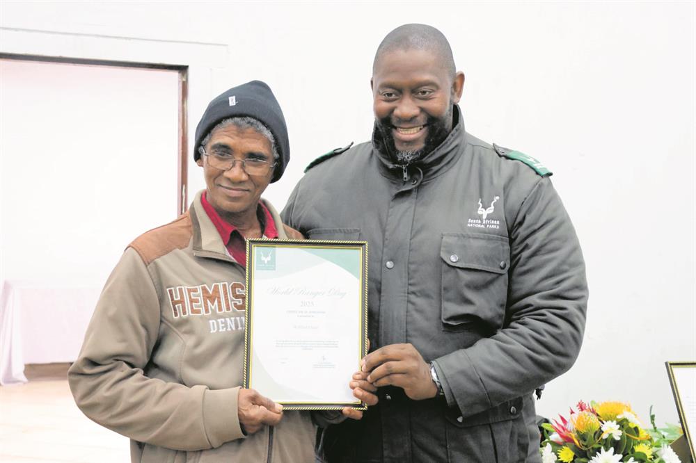 Regional general manager Victor Mokoena (right) awards a certificate of appreciation to the retired ranger, Wilfred Oraai (left).