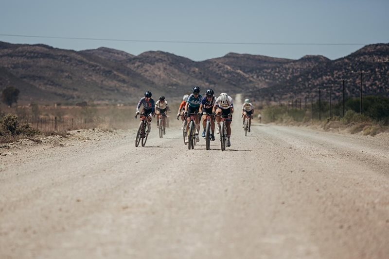 The stage began with blue skies and a brisk start from Avontuur Burn Camp. After 11km of tar, the gravel began to bite, and the bunch quickly fractured on the first major challenge of the day, the Shallot climb.