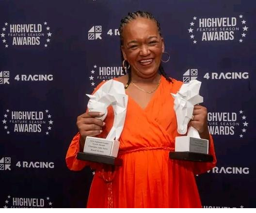 Natasha Sturdy with the Champions Middle Distance Horse and Champions Older Horse trophies Royal Victory won at the recent 4Racing Highveld Awards in Johannesburg. Jockey Muzi Yeni was on board for both those feature wins.
