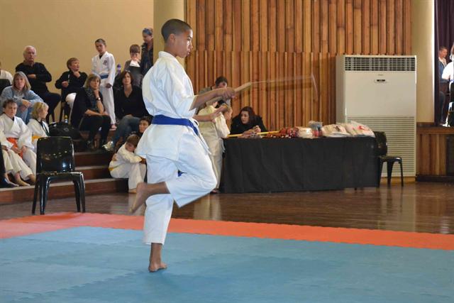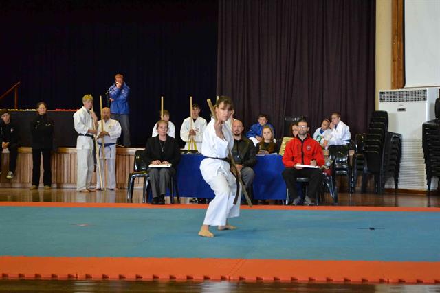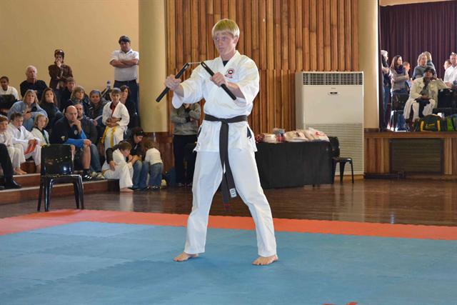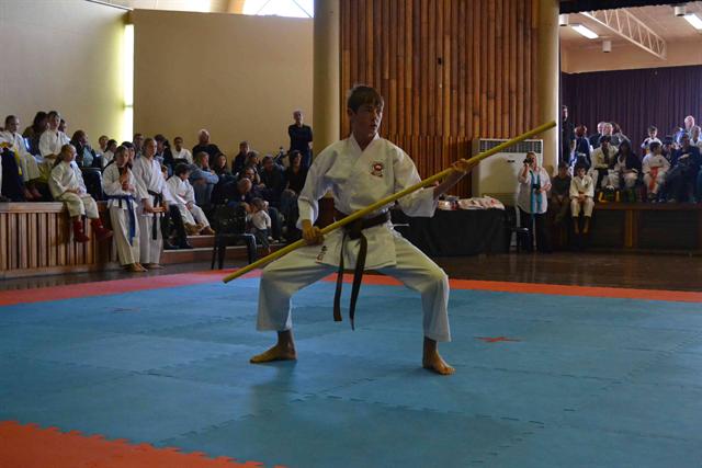 Students competed in the traditional forms for Bo (long staff), Nunchaku, and Sai.